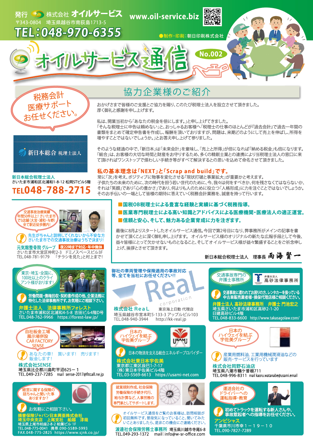 Post navigationPreviousPrevious post:【オイルサービス通信No.001】オイルサービス通信発行についてNextNext post:【オイルサービス通信No.003】協力企業様のご紹介 企業向け出張整体 FIELD