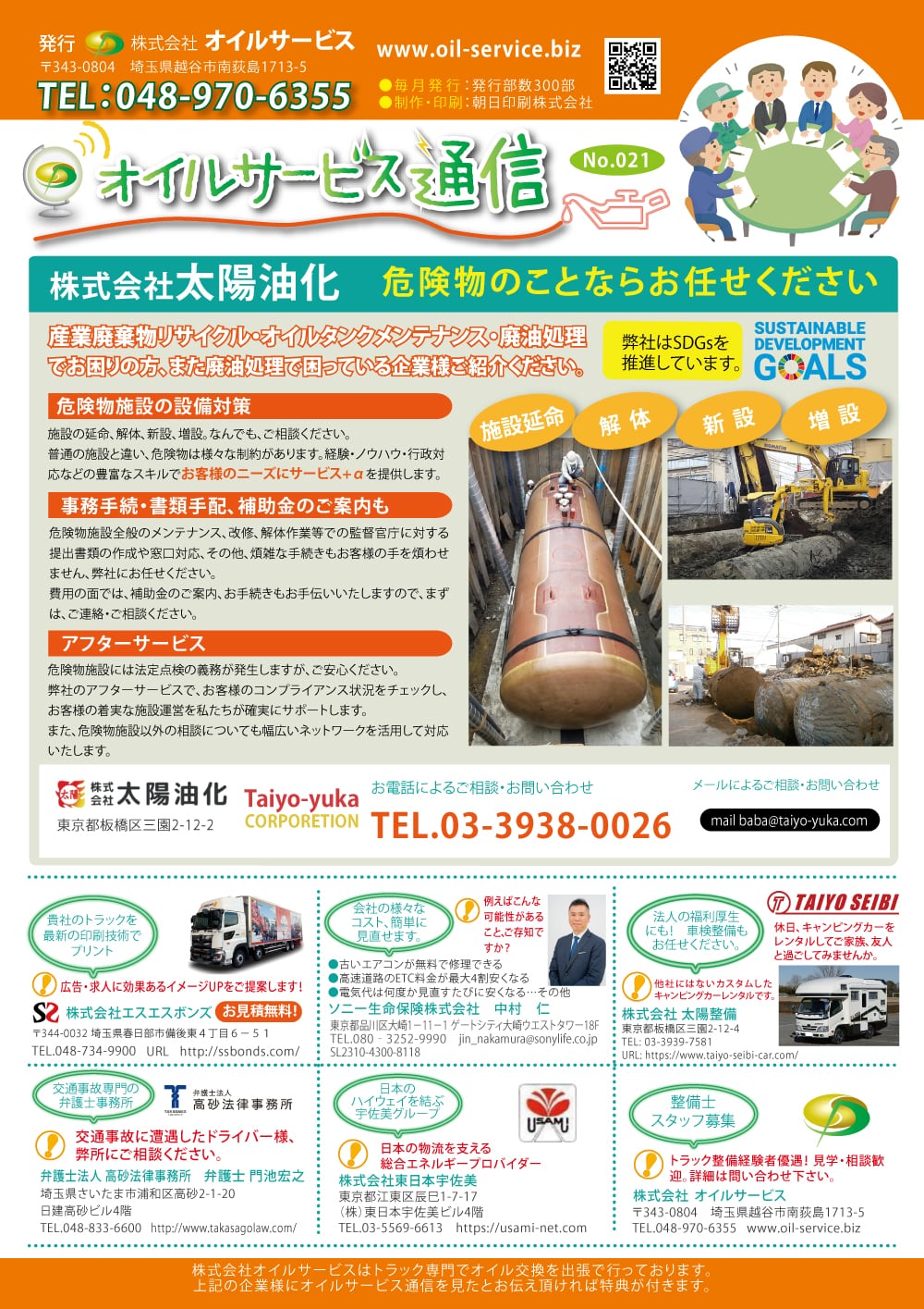 Post navigationPreviousPrevious post:【オイルサービス通信No.020】運送会社の皆様へ!ワンストップで煩わしい手続き等がすべて解決NextNext post:【オイルサービス通信No.021】企業向け主張整体FIELD~運転中や作業中の腰や肩の痛みのある方へ~