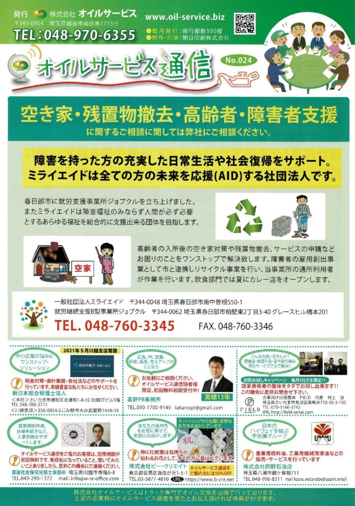 Post navigationPreviousPrevious post:【オイルサービス通信No.024】助成金制度推進センターNextNext post:【オイルサービス通信No.025】朝日印刷(株)~広告宣伝&コロナ対策ご相談ください~