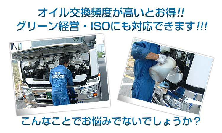 埼玉県越谷市のトラック全般出張オイル交換サービスの株式会社オイルサービス(埼玉)では小型/中型/大型トラック/大型特殊/けん引車/トレーラー/営業車保有の運送会社様向け、出張費・工賃無料オイル交換で時間コスト削減。グリーン経営、ISO対応も。